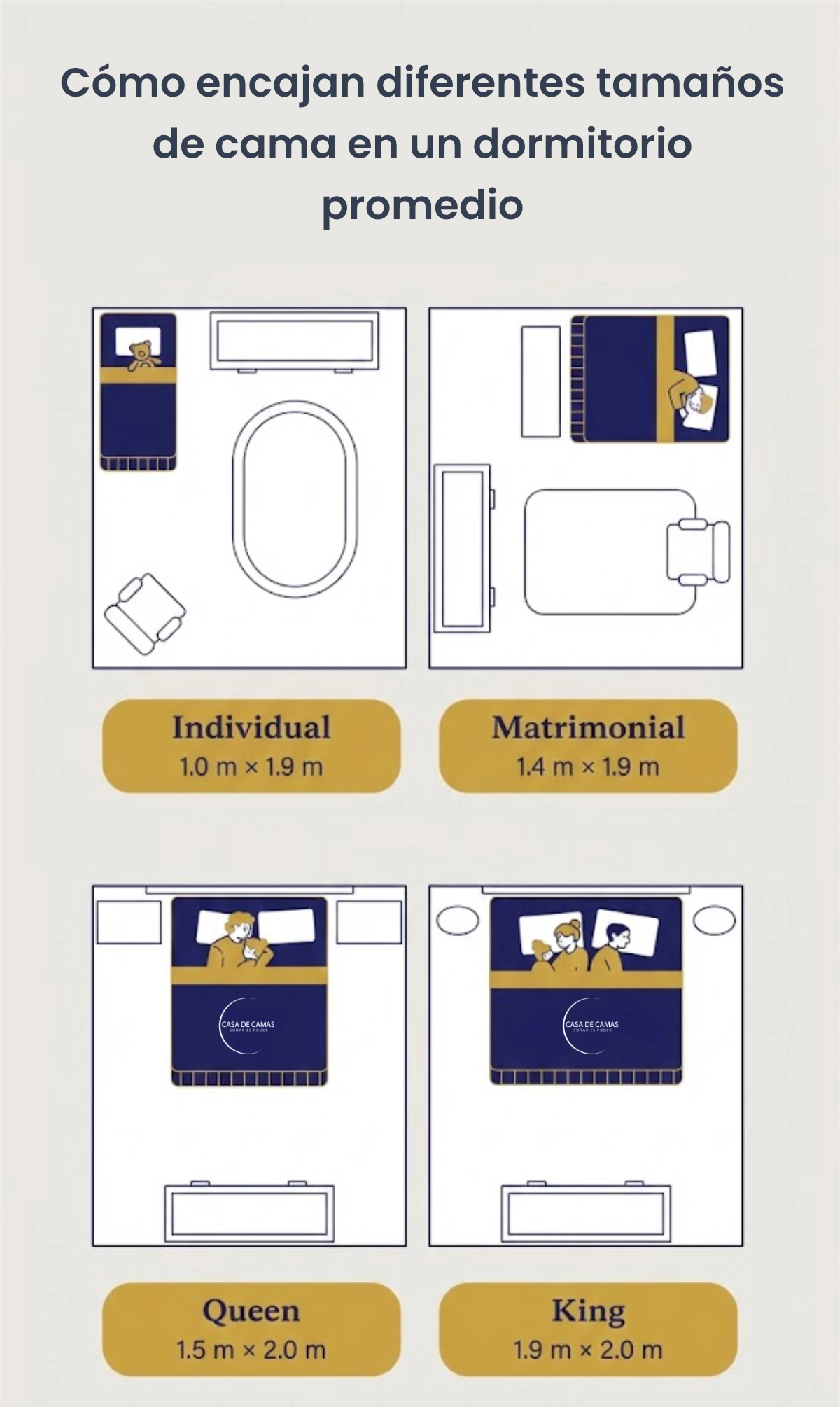 | Matrimonial | 1.35 × 1.90 m | Parejas en espacios reducidos |